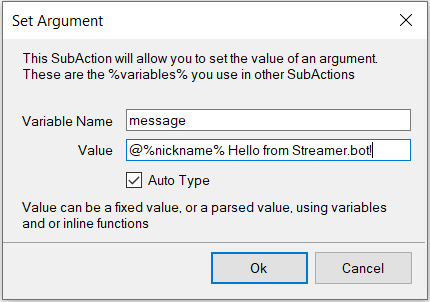 You can also send messages to your TikTok chat via Streamer.bot. To do this, go to the chatbot settings on TikFinity and activate the "Allow Streamer.bot to push messages to TikFinity" option. Then create a Streamer.bot action and add the following steps in the sub-actions:- Core > Arguments > Set Argument: Create a variable with the name "message". The value is your message text to send. You can use all the variables listed above in your message text, e.g. %nickname% to mention the trigger user.
