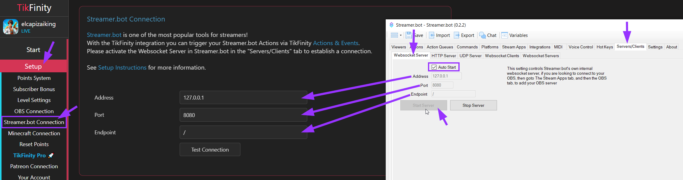 Please download the latest version of Streamer.bot and activate the "Websocket Server", which you can find in the "Server/Clients" tab. Then switch to TikFinity and go to "Setup" -> "Streamer.bot Connection" to set the connection details. In most cases, the default values are fine. Click on "Test Connection" to check if the connection is working. If it is, you can start using Streamer.bot in the TikFinity Actions.