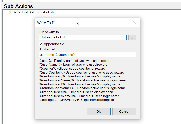 Also note that the information of the trigger user, e.g. the user name, is transmitted as a placeholder parameter. These placeholder parameters can be used in Streamer.bot for further processing. The following placeholder parameters are available depending on the event type: